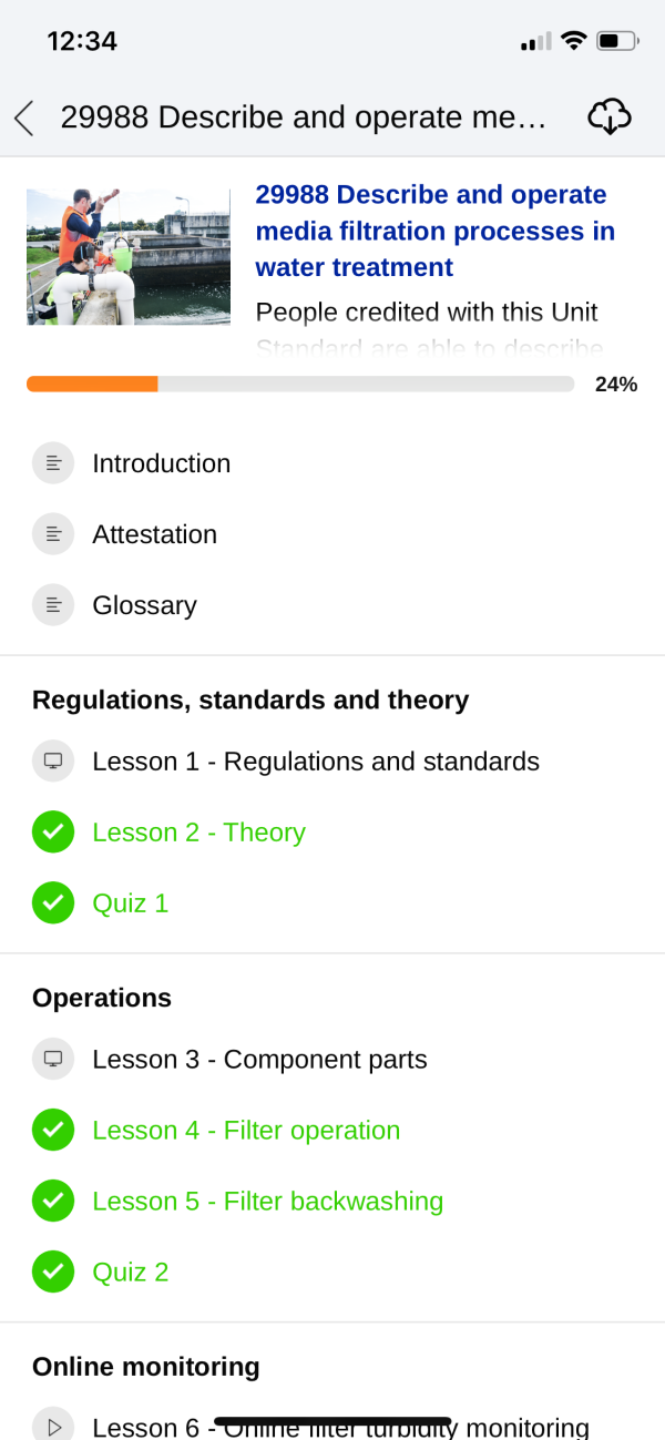 The qualifications are delivered using a blended learning model made up of; online theory (e-learning), site-based assessment, and a 5-day practical block course. Lutra was engaged to develop the e-learning content for 27 Unit Standards (a Unit Standard typically covers one topic e.g. media filtration). The e-learning content must undergo a rigorous quality control process by Connexis and this is complete for most of the Unit Standards.