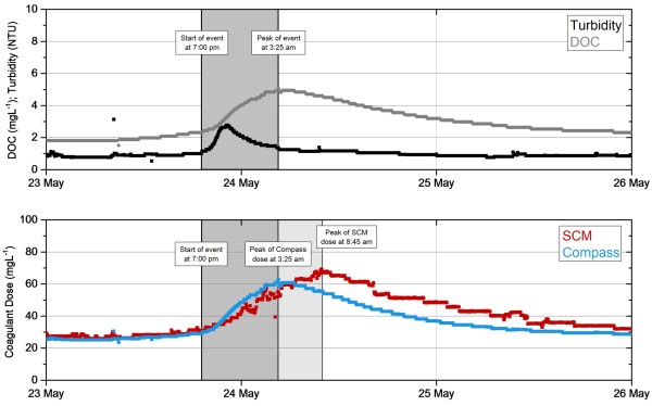 Following a rain event in the catchment, it can be seen in the upper chart that the raw water DOC began to increase slowly and at about 7:00 pm the turbidity also began to increase. While the turbidity peaked, and then reduced, the DOC continued to increase and peaked at 3:25 am. The lower chart shows that the Compass dose calculation increased and peaked at the same time as the DOC, while the SCM dose was slower to react, under dosing for around 6 hours, and peaked at 8:43 am, more than 5 hours after the peak in DOC. The SCM dose also took almost 2 days to return to the correct dose.