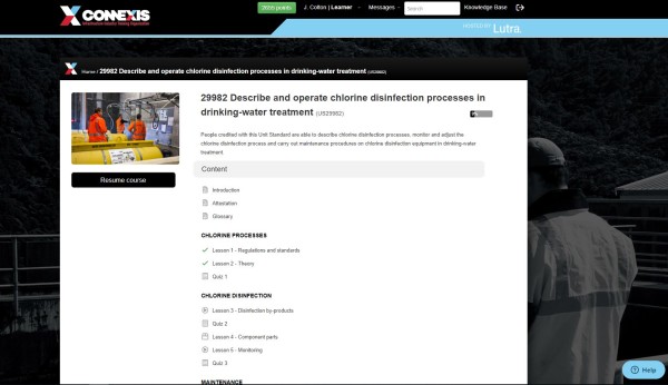 The qualifications are delivered using a blended learning model made up of; online theory (e-learning), site-based assessment, and a 5-day practical block course. Lutra was engaged to develop the e-learning content for 27 Unit Standards (a Unit Standard typically covers one topic e.g. media filtration). The e-learning content must undergo a rigorous quality control process by Connexis and this is complete for most of the Unit Standards.